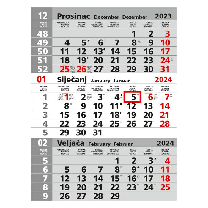 KALENDAR ZIDNI TRODIJELNI - SIVI bez zaglavlje i spirale, dimenzija: 29,5x39,3 cm, pokazivač trn, obilježeni međunarodni praznici, isti kao kalendar šifra: 000002150